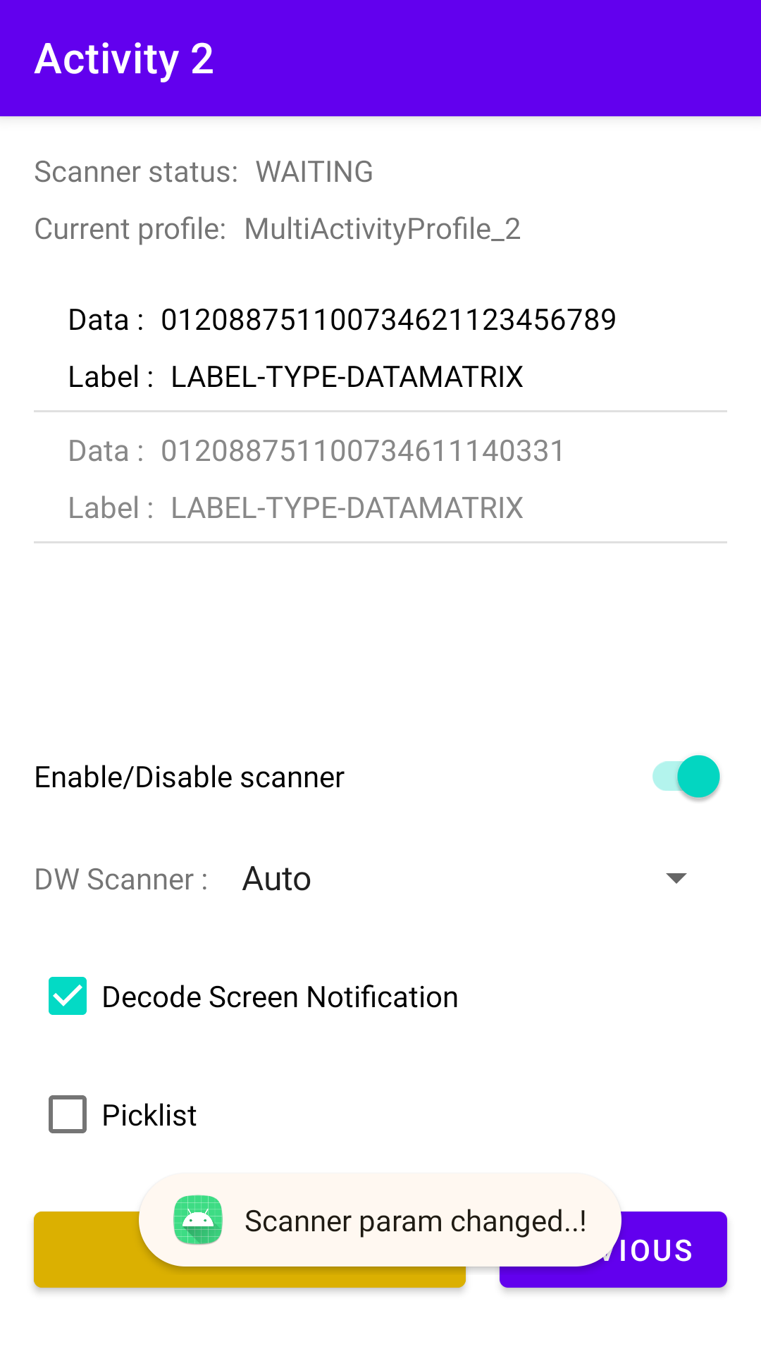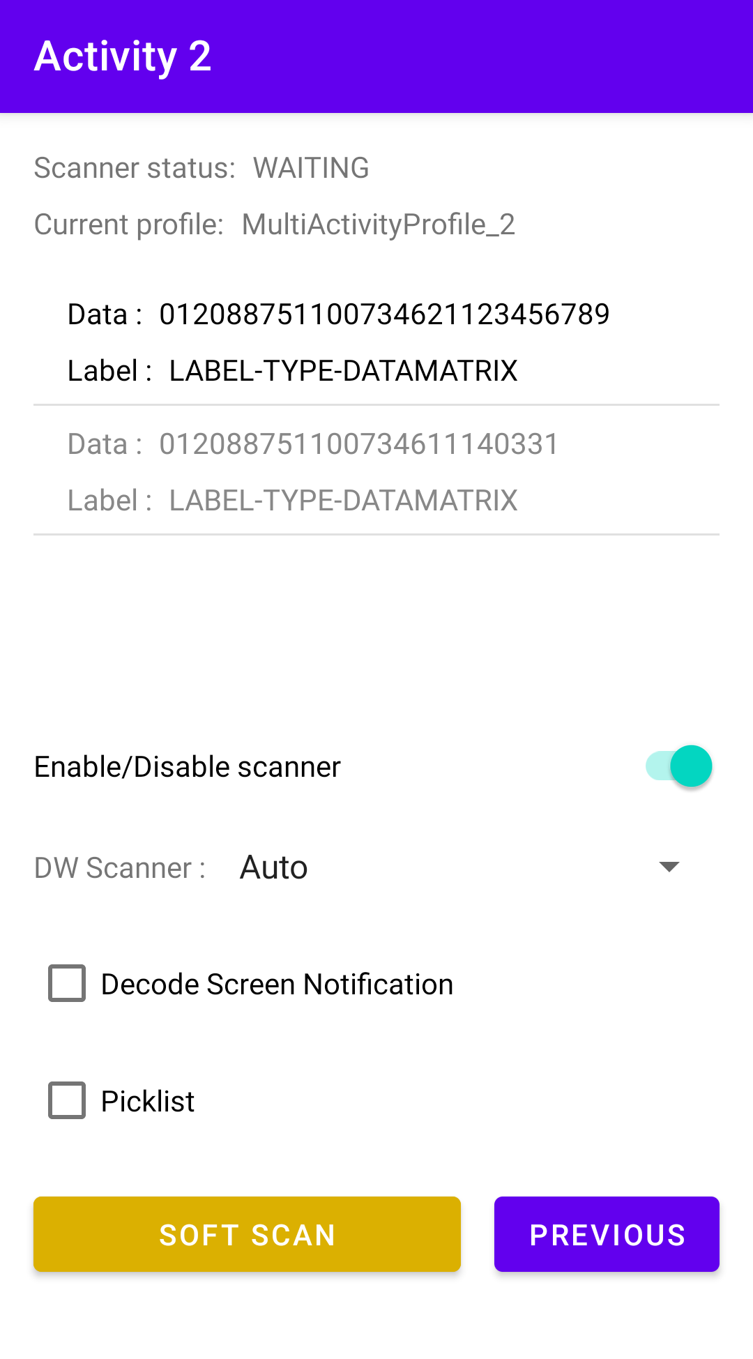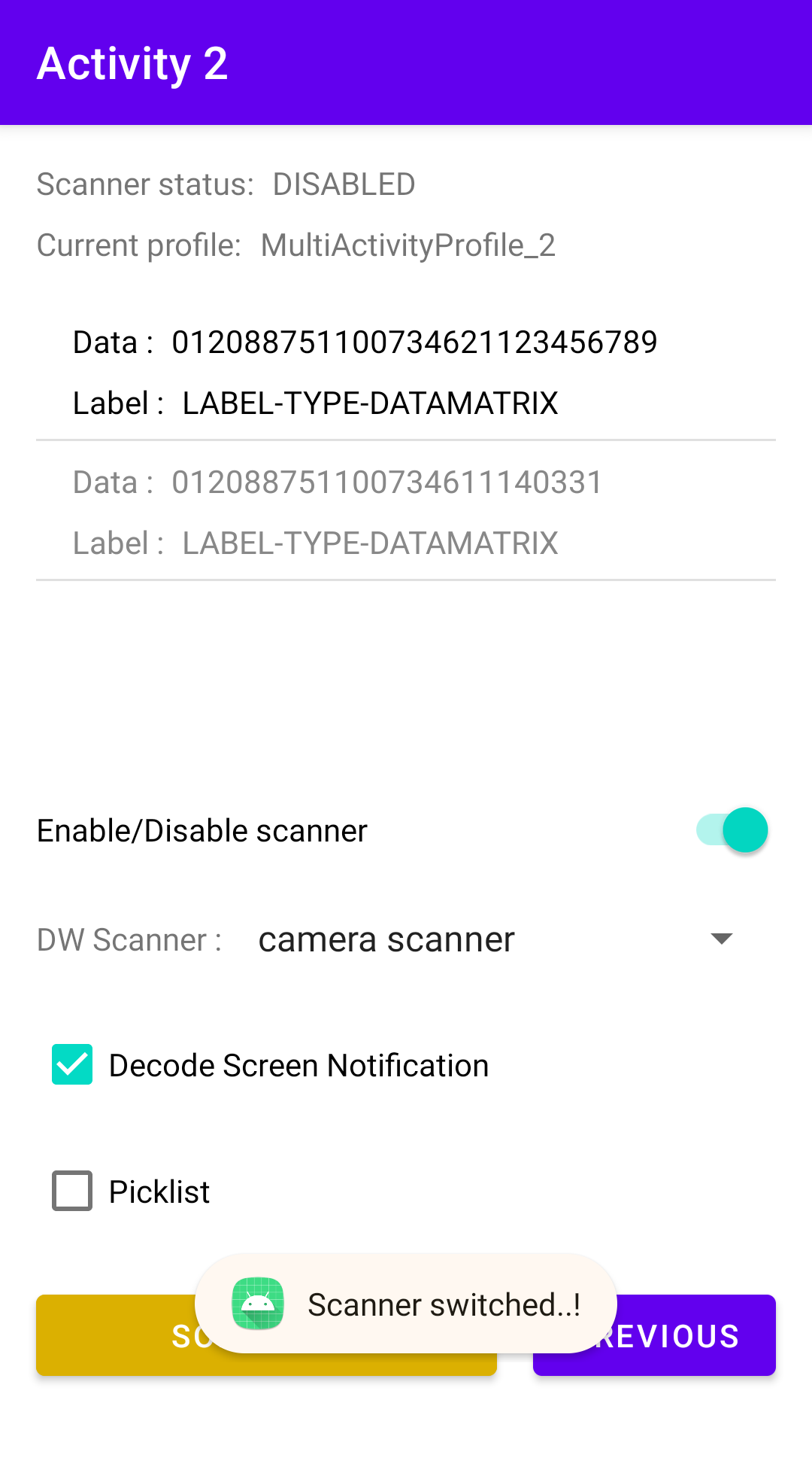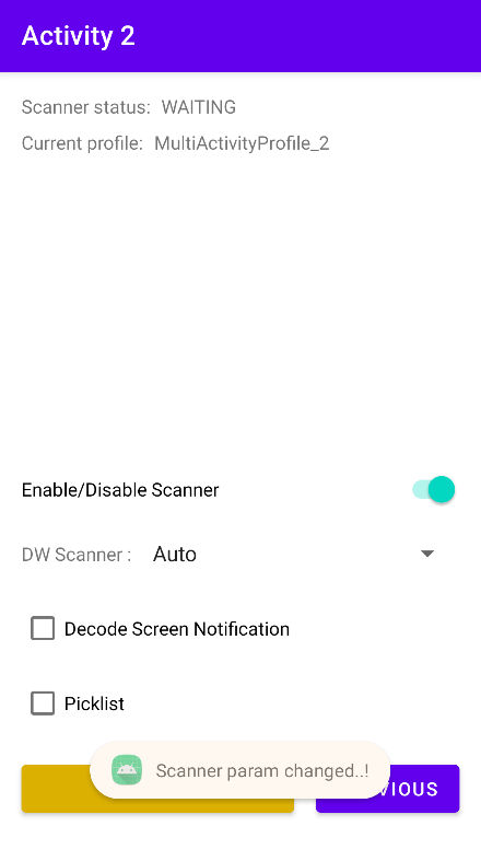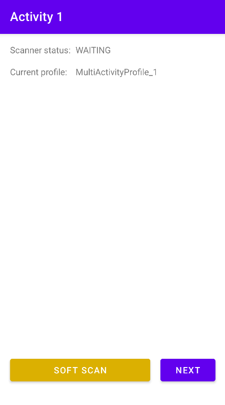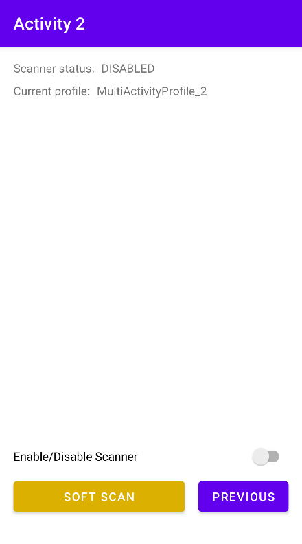 In this next activity, the app automatically attempts to switch to the associated profile, “MultiActivityProfile_2,” by invoking the Switch to Profile API. By default, the scanner is disabled.