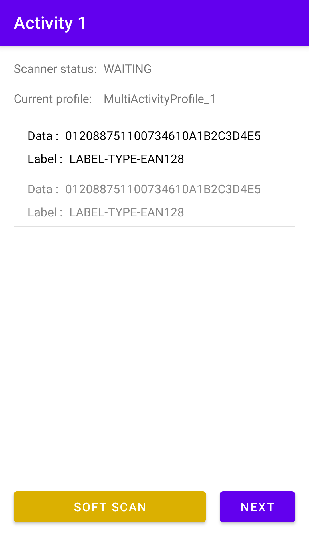 Press the physical trigger button or toggle the soft scan button to perform a scan. The barcode data and symbology is displayed. Tap Next to proceed to the next activity.