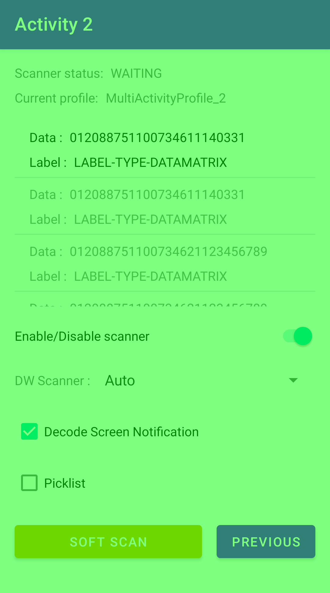 Press the physical trigger button or toggle the soft scan button to perform a scan. The scanned data is displayed. If Decode Screen Notification is enabled, the screen turns green briefly upon a successful decode.
