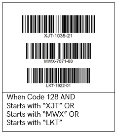 For example: The user wants a rule that applies when a code 128 barcode starts with XJT, MWX, or LKT. In this simple case, the ADF interpreter applies the following Boolean Operators according to its requirements.