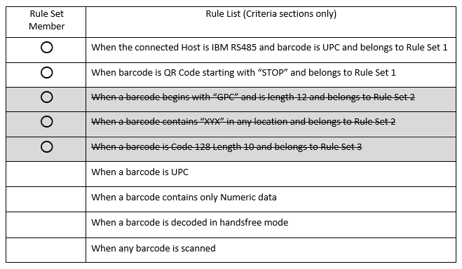 For example: If the rule buffer contains the sample set of rules in the previous section, then the ADF Interpreter will run them as follows. The left column shows what barcode is scanned, and the remaining columns show what rules applied due to the “Exit Rule” recovery process.