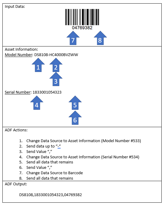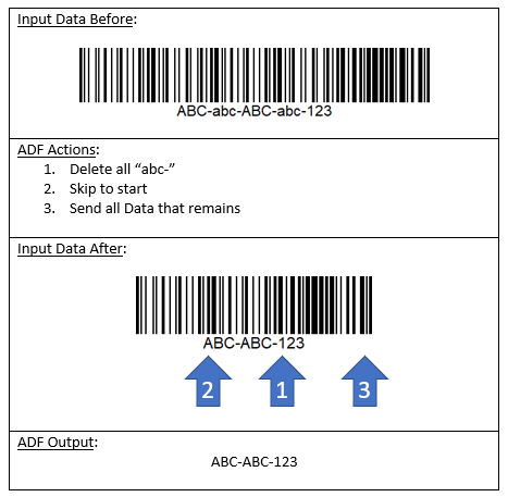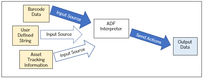 In summary, ADF is configured by writing one or more rules using the 123Scan2 graphical interface. These rules are transmitted to the scanner and stored in its Flash memory. When a barcode is scanned these rules are checked to see if a rule is found that would apply to the data.