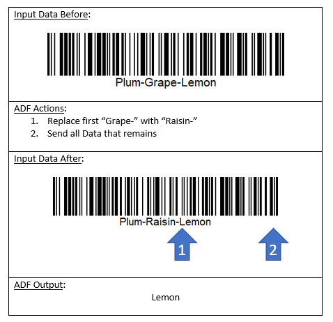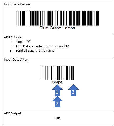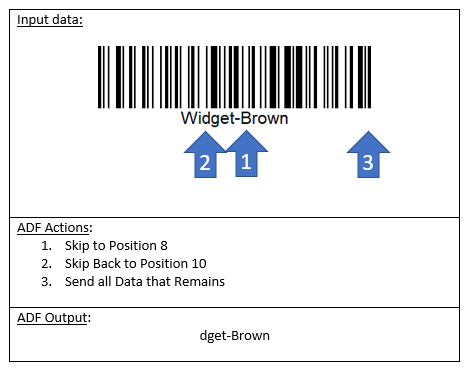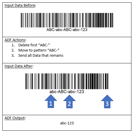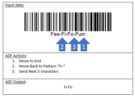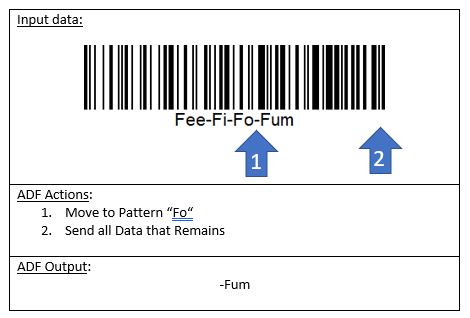 ADF can check for patterns of data within the scanned barcode: At the start, at the end, at a specific position in the data, or in any position. Position numbers start with 1 at the first character of the scanned barcode data.