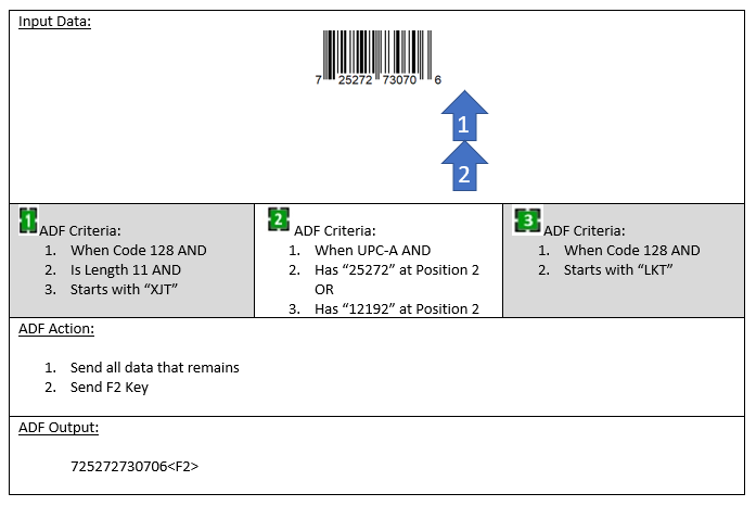 The following are examples of what could be programmed in an ADF rule and the types of barcodes that would cause the rule to apply.