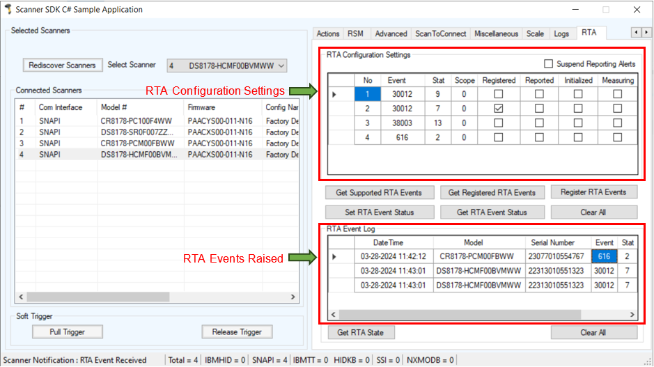 The following summarizes the features supported in the RTA tab of C# Sample Application for RTA configurations and RTA events. RTA supports the following list of scanners.