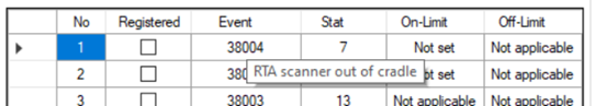 - The "Registered" Column indicates whether the event is registered in the scanner. Unregistered events can be registered using the check box in this column.