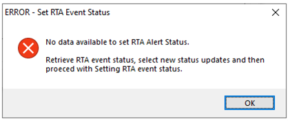 NOTE - Query the RTA event status and update the new status values prior to calling "Set RTA Event Status". If no data is available to set RTA event status, the following message will be shown.