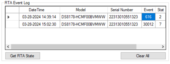 - Clear All option clears the content in the RTA Event Log grid. Note - this only clears the RTA data populated in the UI and does not include any configuration to the scanner.