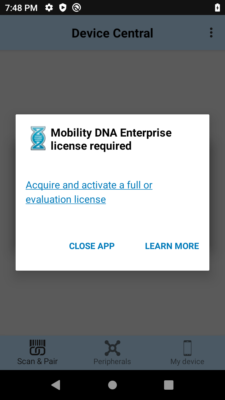Beginning with Device Central 3.0, a Mobility DNA Enterprise license is required to use Device Central on Zebra Professional-series devices, including TC21 and TC26. When unlicensed, the app displays a “Mobility DNA Enterprise license required” prompt (see below) when a user attempts to open Device Central. Learn more about purchasing an MDNA Enterprise license.