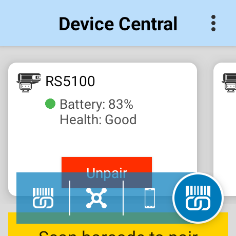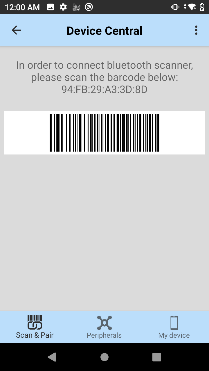 Upon launching Device Central, a DataWedge profile named "DeviceCentral" is created for scanning support. This profile is not intended to be modified - the profile settings are reset to the defaults upon each application launch. The 2 methods to scan the peripheral’s Bluetooth barcode to pair are: