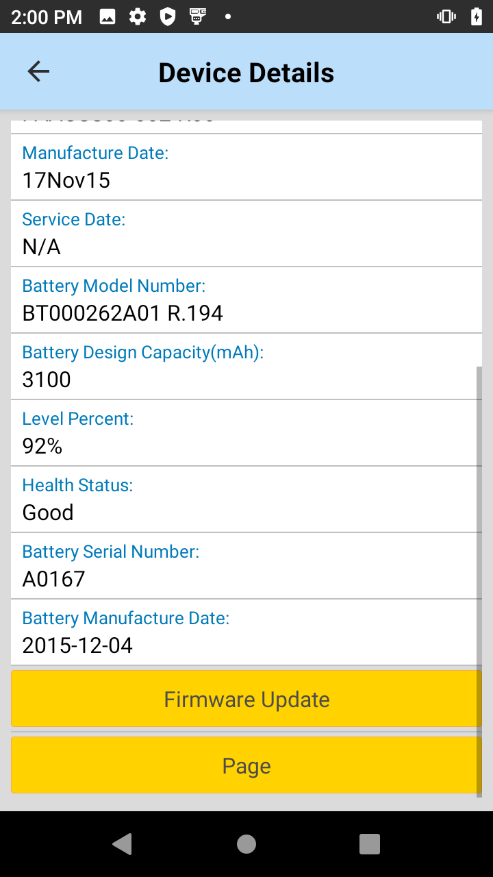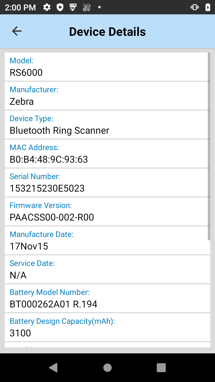 The device information listed may vary depending on device type and manufacturer. This information may include: device model, manufacturer, Bluetooth Mac address, serial number, battery information, etc. If supported, the details screen may provide buttons at the bottom to allow tasks to be performed, such as Update Firmware or Page an attached RS6000 Ring Scanner. The following displays a sample of a paired peripheral: