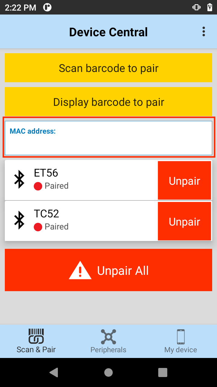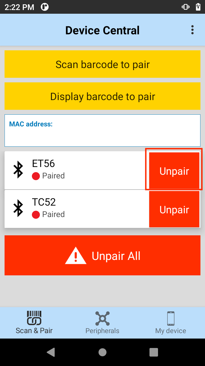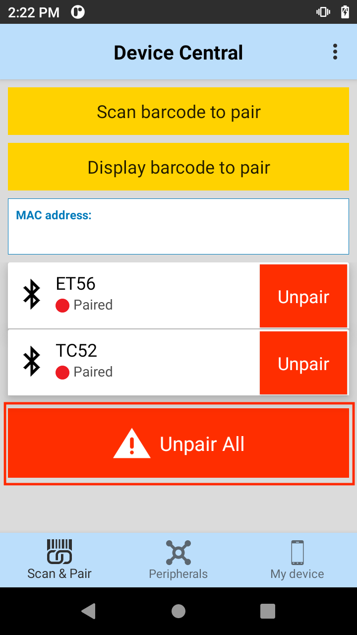 In the Scan and Pair tab, if multiple peripherals are available, tap the Unpair All button to unpair all peripherals.