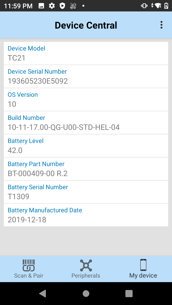 The My Device tab displays information pertaining to the Android device which Device Central is running on and its battery. This information includes: device model, device serial number, OS version, system build number, battery level, battyer part number, battery serial number, and battery manufactured date.