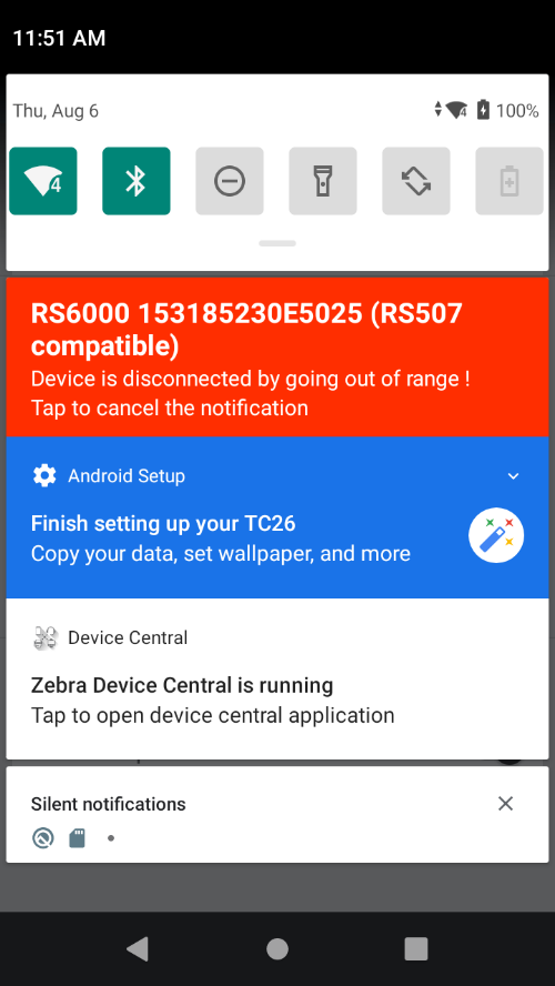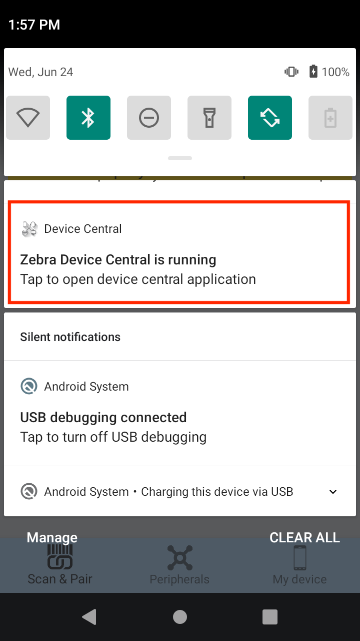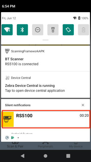 - When connected to the device, only Zebra Bluetooth scanners are listed in the notification drawer in Android. All other peripheral devices are listed in the Device Central main UI.