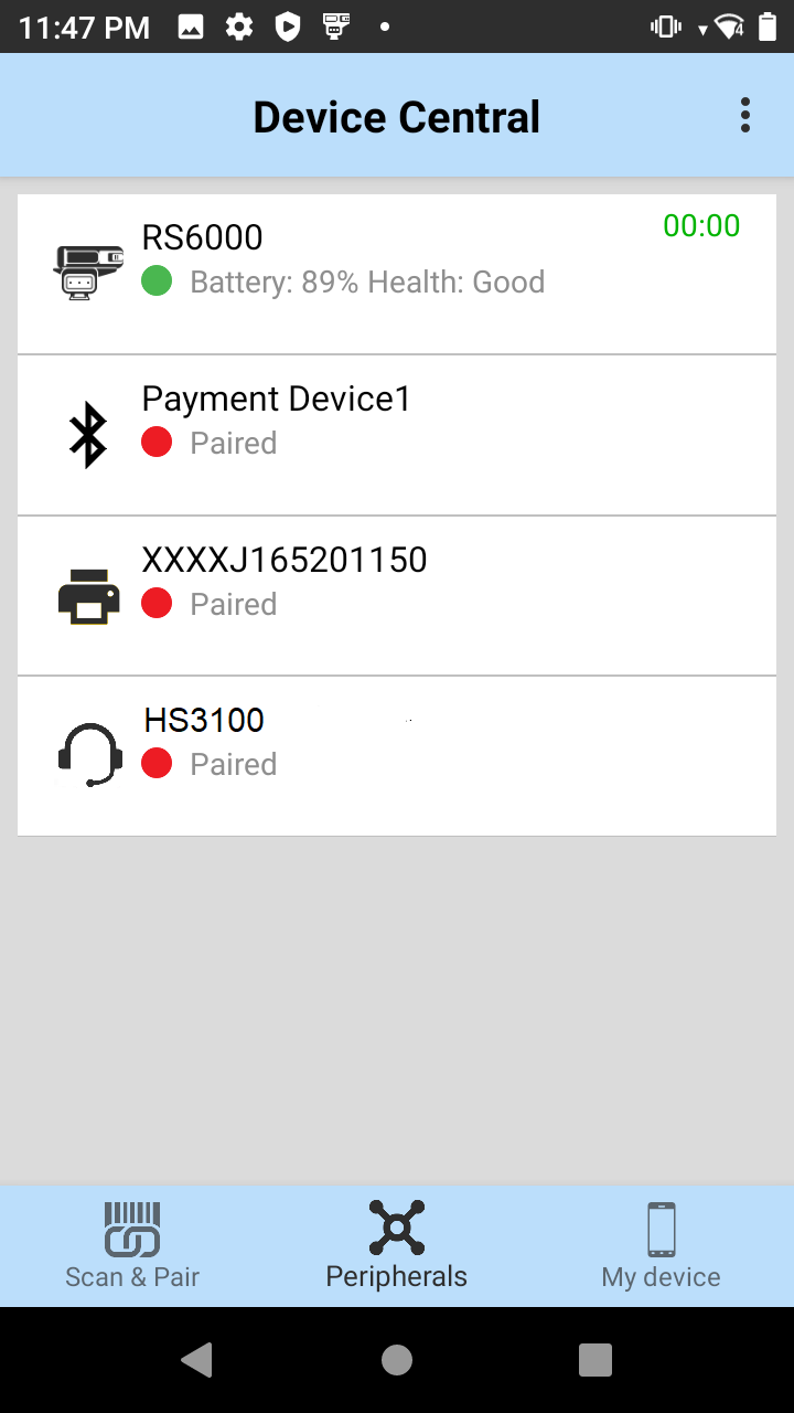 When pairing is successful, the peripheral is displayed in the list. A green dot next to a Bluetooth scanner indicates that the device is connected and may be in use. Other peripherals such as a Bluetooth headset or printer will have a red dot until the respective application is using these Bluetooth peripherals.