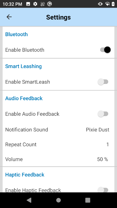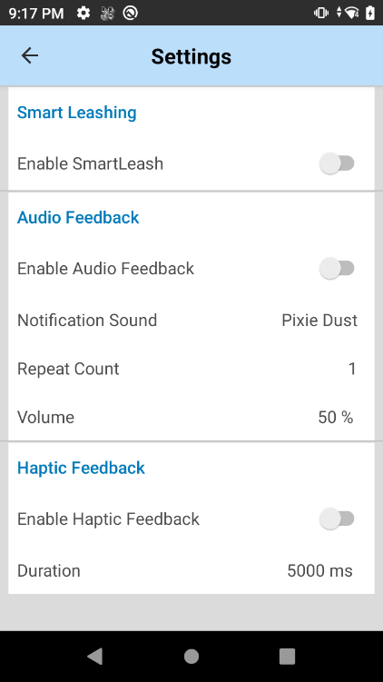 Toggle to enable Smart Leash. Optionally, toggle to enable other feedback and related options: