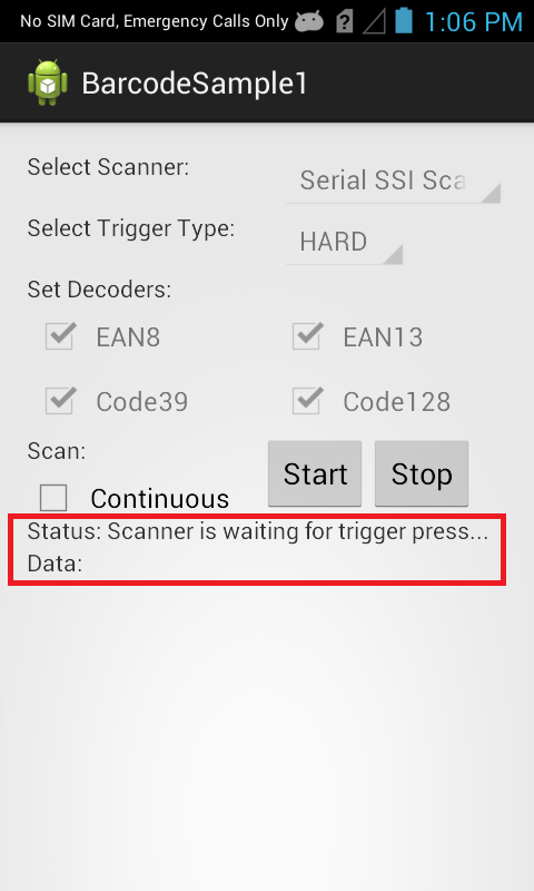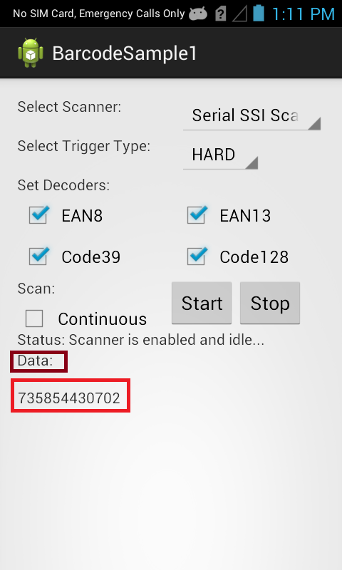 6. Since we selected Trigger Type as "HARD", press the hard scan key of Symbol device and scan a particular barcode. It will get the scanned barcode data in "Data" field of UI.