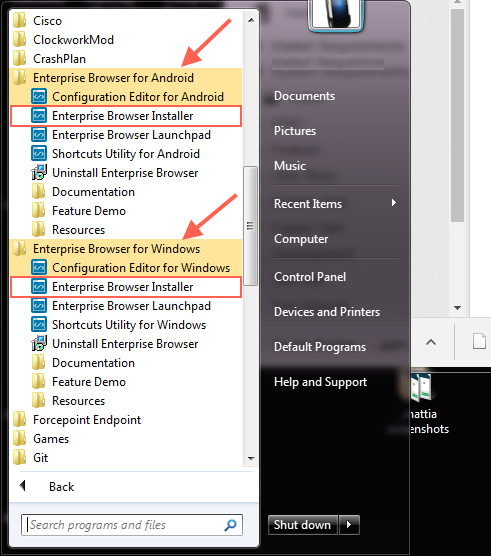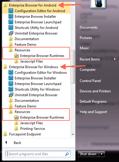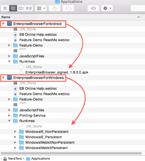 Locate the Enterprise Browser runtime files on the installation host. This process varies from Windows and Mac OS X and hosts. Both are exaplained below. Note the separate folders for different target platforms.