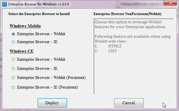 The Enterprise Browser deployment tool appears in a window similar to one of the images below (depending on the platform being targeted).