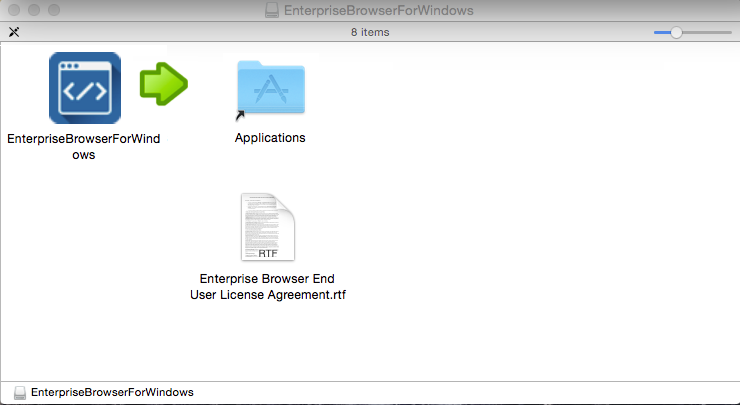 Drag and drop the Enterprise Browser icon onto the Applications folder (in the direction of the arrow). This copies the Enterprise Browser files and folders into the Application folder on the host Mac, creating a directory structure similar to the one shown in the image below:
