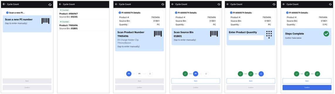 Get a physical inventory list of Cycle Count from warehouse, then execute workflow as Cycle Count. If the user selects any of the physical inventory from the list, all the products that belong to that physical inventory is listed with status as "counted" and "uncounted." The user can select any of the products, and if the user selects a product that was already counted, a pop-up informs the user and asks if the unit should be recounted. It then executes the Cycle Count workflow.