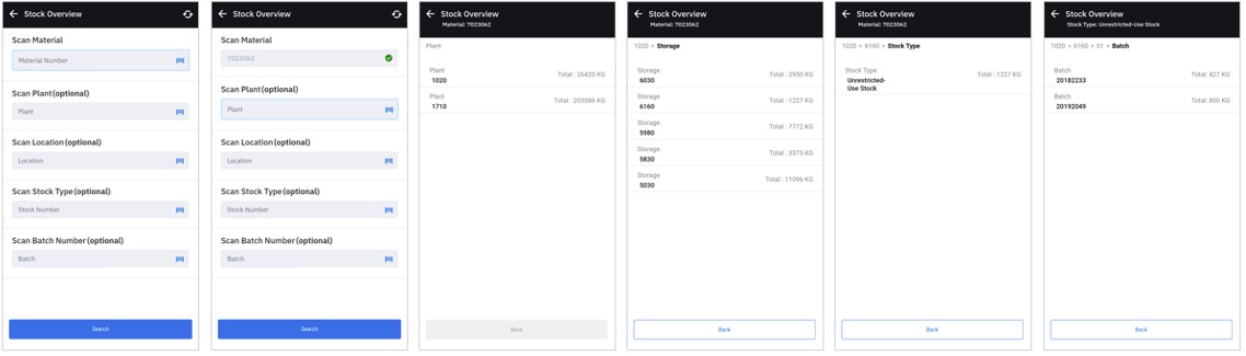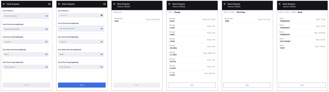 • App shows details of the Material Number such as Warehouse, Source Bin, Stock Type and Batch, depending upon the input provided