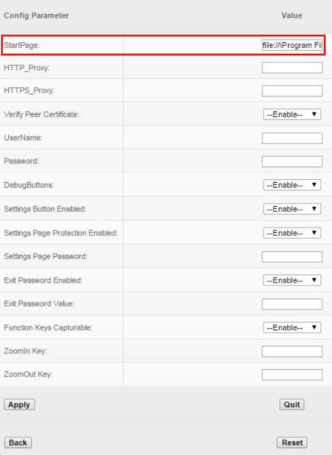 To activate an EB app's start page, enter the URL in the Value field of the StartPage parameter, as highlighted above, but do not apply the changes yet. Applying changes immediately will cause the new start page to be displayed next time EB is launched and will remove access to the Settings panel.