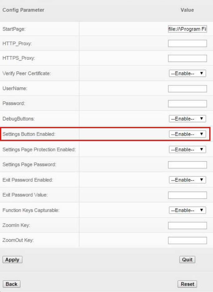 If on-device access to runtime settings is desired after setting up the start page (for example, to experiment with various settings before deployment), set the SettingsButtonEnabled parameter to "Enable" (as below). This will cause a Settings button to appear in the UI at all times. Passwords also can be set here, if desired.