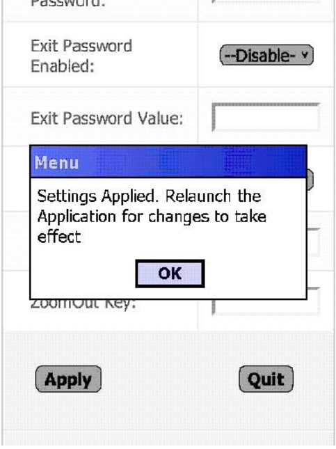 Press "Apply" to update the Config.xml file with the new settings. A screen like the one below will be displayed. Restart the app to activate the changes.