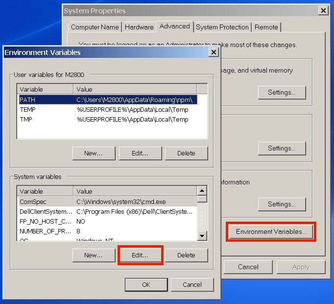 - In the "Advanced" tab, Click the "Environment Variables" button to bring up a window similar to the one below: