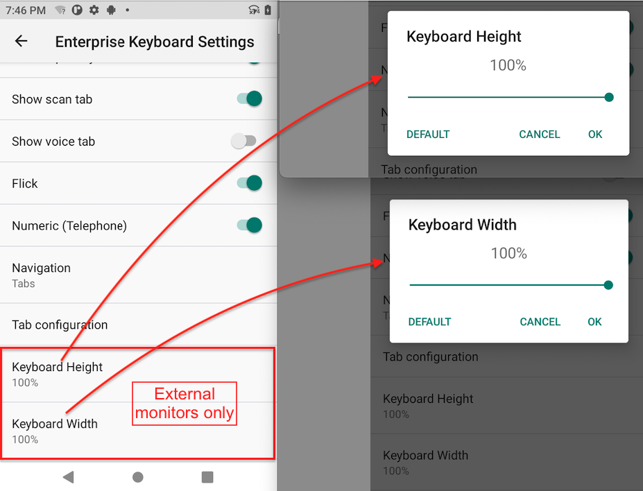 • Keyboard Width used to reduce the width of the keyboard (as a percentage from 25–100 of the default width) when it appears on an external monitor as with Zebra Workstation Connect. See ZWC notes.