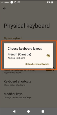 2. In the Android Settings panel, go to System > Languages & input > Physical keyboard* and tap the desired language layout: