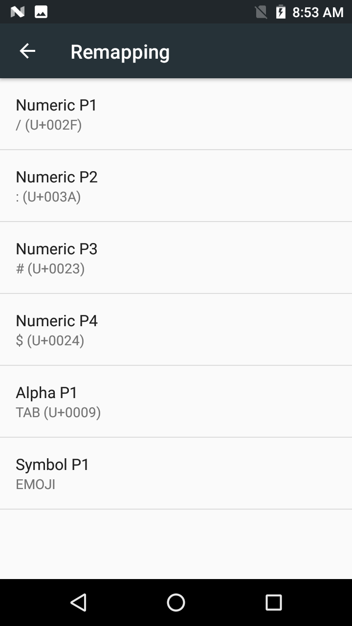 • Enabling the Alphanumeric tab disables remapping of the Numeric P4 and Symbol P1 keys.