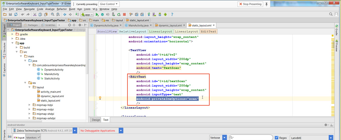 • Include the line android:privateImeOptions="scan" in the <EditText> field of the StaticLayout.xml file as shown below: