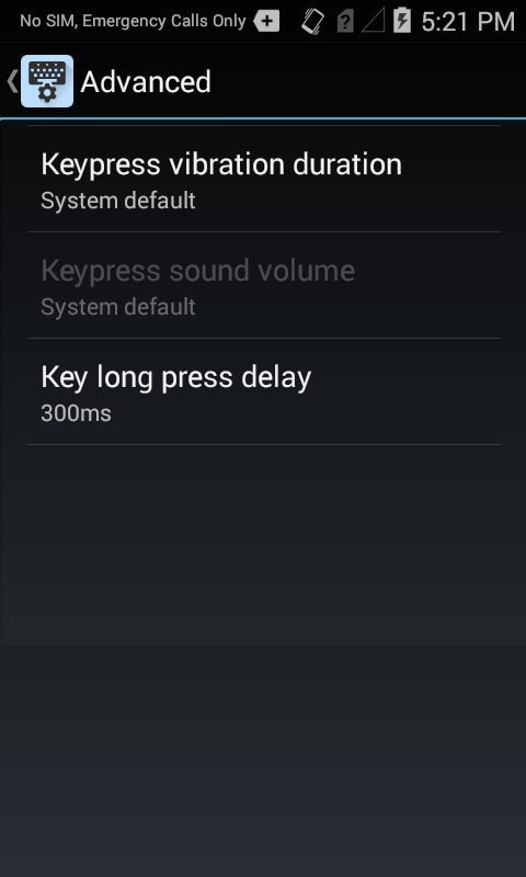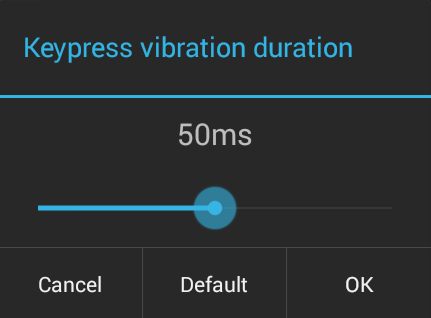 Keypress vibration duration sets the length of time (from 0–100ms) the device will vibrate to indicate that a key was pressed (default = 0ms).