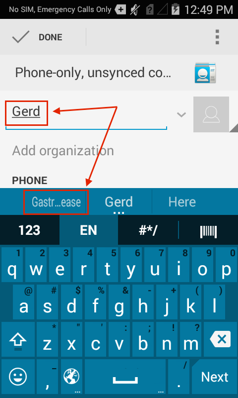 When a shortcut is typed as input, its associated term will appear in a list of spelling corrections: Press the spacebar to accept the highlighted word (which in this case is "Gerd") or tap the desired word or phrase to insert it.