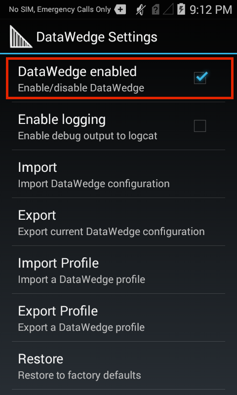 3. The DataWedge Settings panel appears. Confirm that the "DataWedge enabled" box is checked.