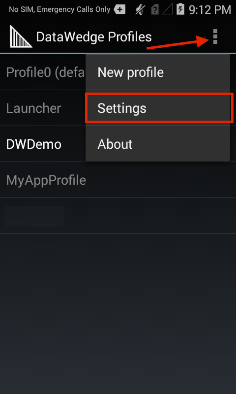 2. From the DataWedge Profiles screen, tap the "hamburger" menu (see arrow), then Tap "Settings" on the menu:
