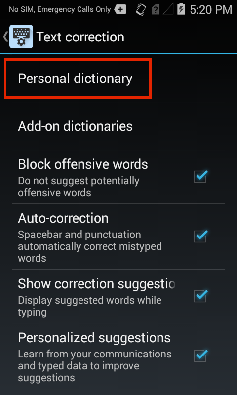 1. Tap "Personal dictionary" in the Text correction Preference panel:
