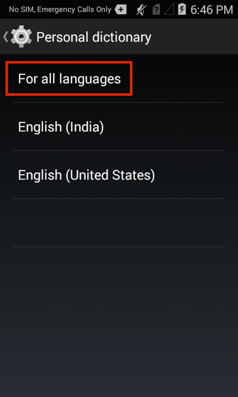 2. Tap the language with which to associate the personal term(s). Select "For all languages" to display Personal Dictionary terms with every language pack: