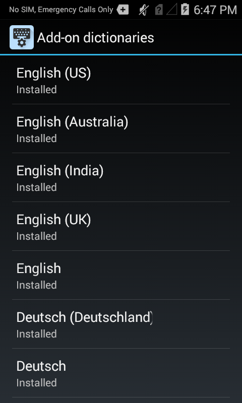 Add-on dictionaries contain predefined word corrections for each language installed on the device. From this panel, user actions are limited to viewing the list of installed Add-on dictionaries and deleting/reinstalling them. No further actions are permitted.