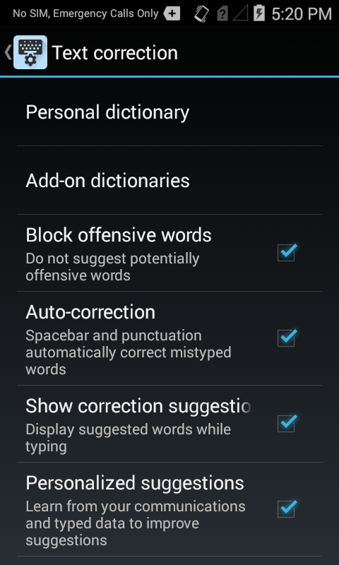 Text Correction controls automatic corrections to typed text based the predefined parameters explained below. This functionality is provided by the Personal Dictionary, which also permits lists of custom or industry-specific terms and shortcuts (abbreviations) to be loaded into a device and presented as substitution suggestions along with those of the selected language(s).