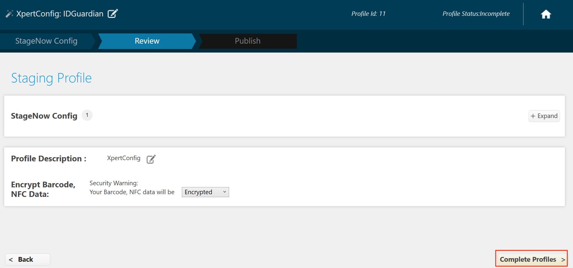 7. Click Complete Profile. The StageNow profile creation is complete.