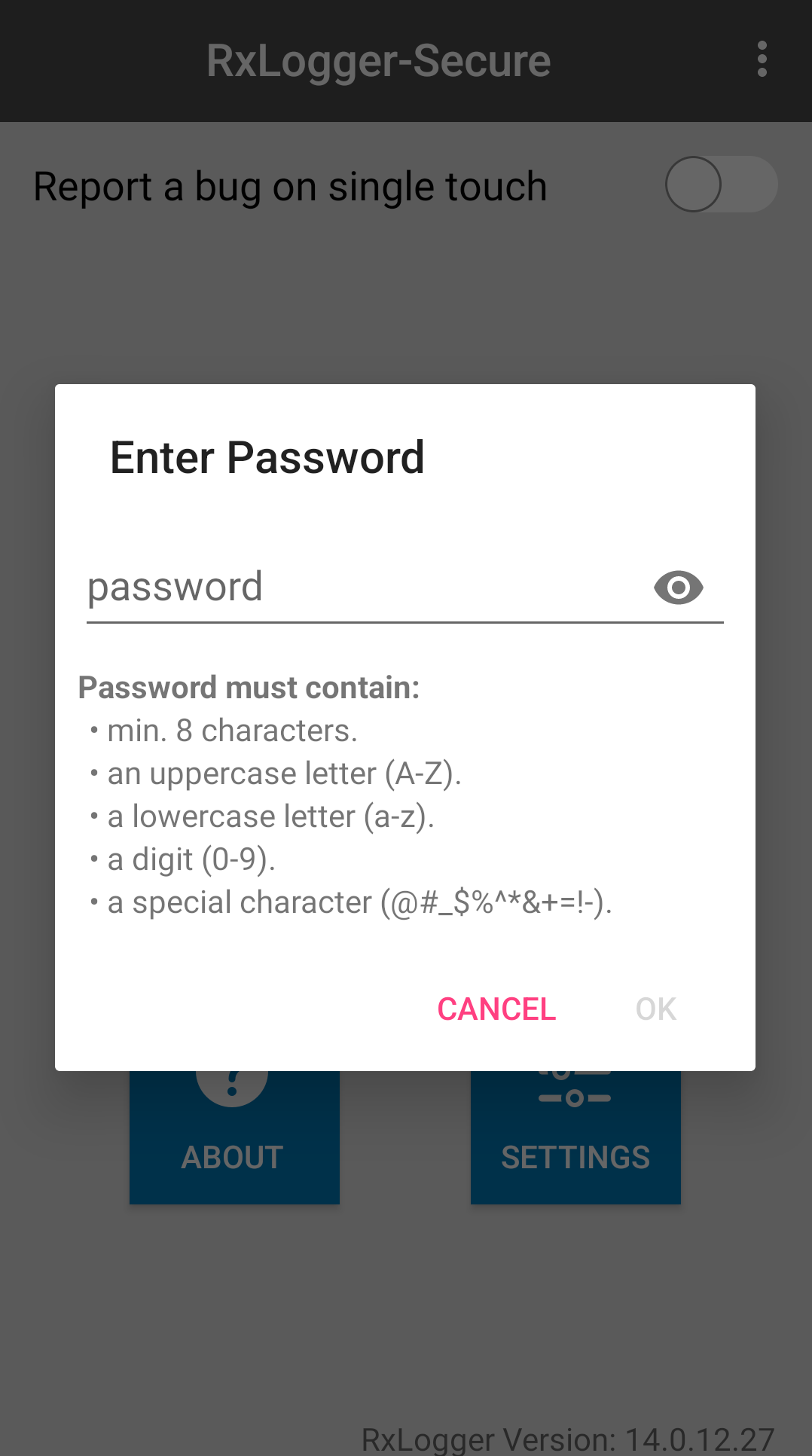 - RxLogger Utility - Tap the round save icon or chat head (not removable by a long press), and input a password.