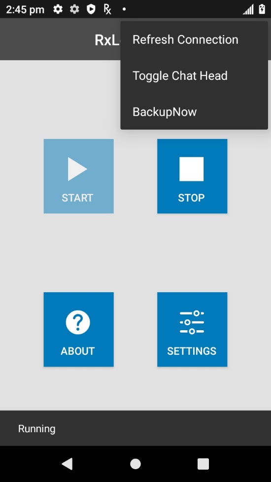 - RxLogger - from the main screen, tap on the top right menu and select BackupNow.