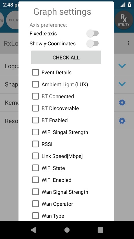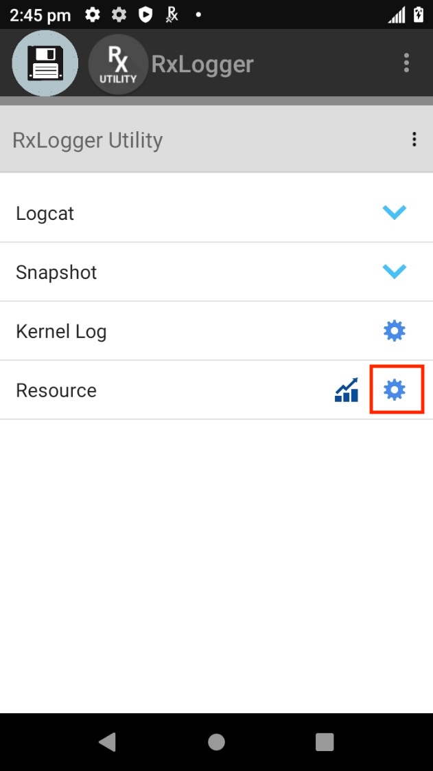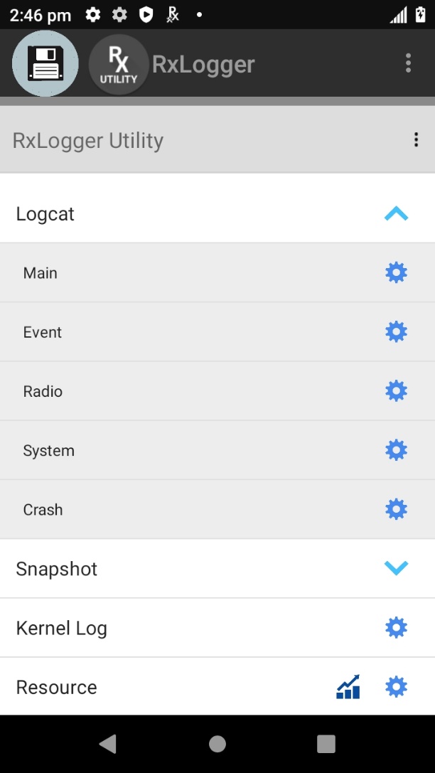 Tap the RxUtility floating icon to display the RxLogger Utility main screen.