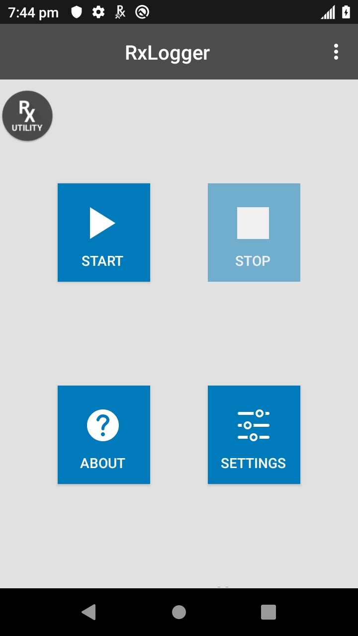 The startup screen of RxLogger contains four simple buttons that change in appearance depending on its state. RxLogger's title bar also reflects the state, and its version number is visible in the lower-right corner.
