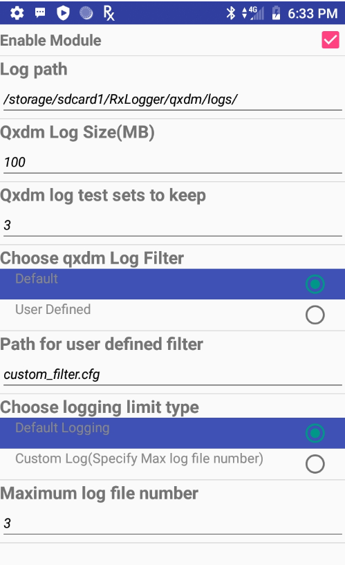 • Enable debug logs - If enabled, the debug logs from RxLogger and Diagdaemon are collected in the location specified in the Settings File section. After enabling/disabling debug logs, tap the back button, tap Save and then reboot the device for the change to take into effect. By default, this option is disabled.