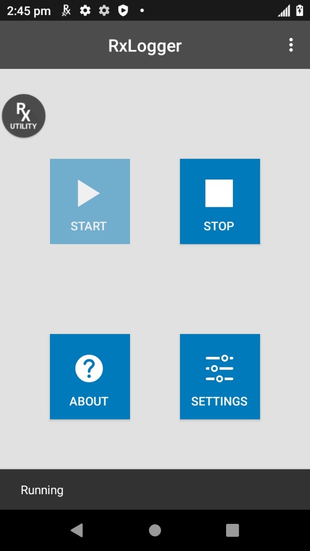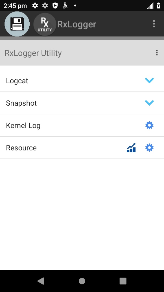 - RxLogger Settings: From the RxLogger main screen, tap Settings. Tap the options menu in the upper right corner and select Reset to default.