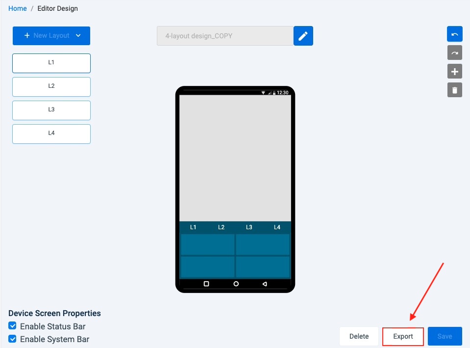 1. Select "Export" from the EKB Design Studio Home screen or the Design Editor screen (shown below).